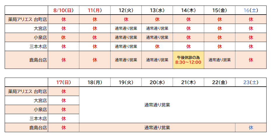 ※鹿島台店は8月14日(木)午前のみの営業となります。